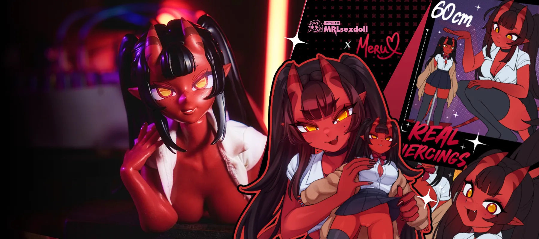 Image of The Meru hentai mini sex doll showcasing its fiery red skin and succubus tail details.